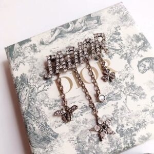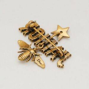 J’Adior Brooch Antique Metal with Star Charm, J’Adior Signature and Bee Charm Embellished Crystals Gold