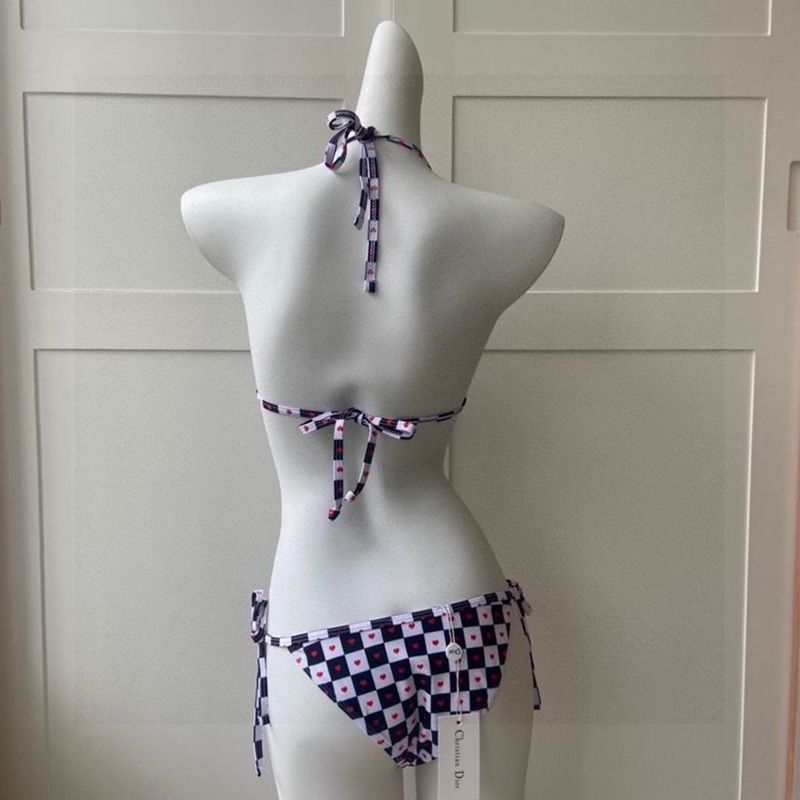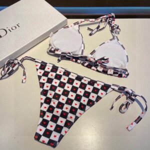 Embark on a stylish adventure with the Christian Dior Bikini for Women, featuring the enchanting Dioramour D-Chess Heart motif in chic black and white. This exquisite two-piece set showcases a sophisticated triangle top paired with briefs adorned with side lacing, seamlessly merging elegance with a playful spirit. Crafted from high-quality Lycra, the fabric not only provides a flattering fit but also ensures comfort and durability for all your summer escapades.