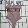 A distinctive feature is the prominent Christian Dior signature emblazoned on the front, which adds a touch of luxury to your beach or poolside look. The contrast band enhances the overall design, creating a stylish silhouette. The swimsuit boasts a flattering round neckline and a racerback design, providing both support and sophistication.