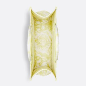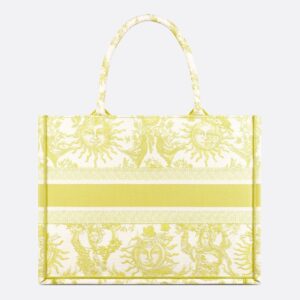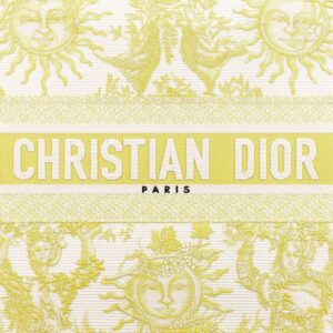 Introducing the Dior Book Tote in a stunning Toile de Jouy Soleil motif, set against a vibrant lemon canvas. This eye-catching piece showcases the iconic Christian Dior Paris signature, making it a true emblem of luxury and sophistication.