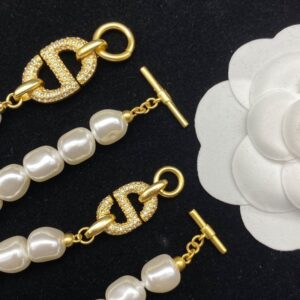 The design features lustrous white resin pearls that radiate charm, expertly paired with a gleaming gold finish metal that enhances its opulence. Furthermore, the CD Signature embellishment, adorned with sparkling white crystals, adds a touch of glamour that gracefully catches the light, making it a perfect choice for both day and night.
