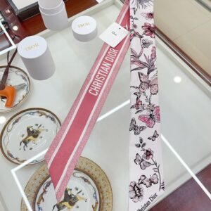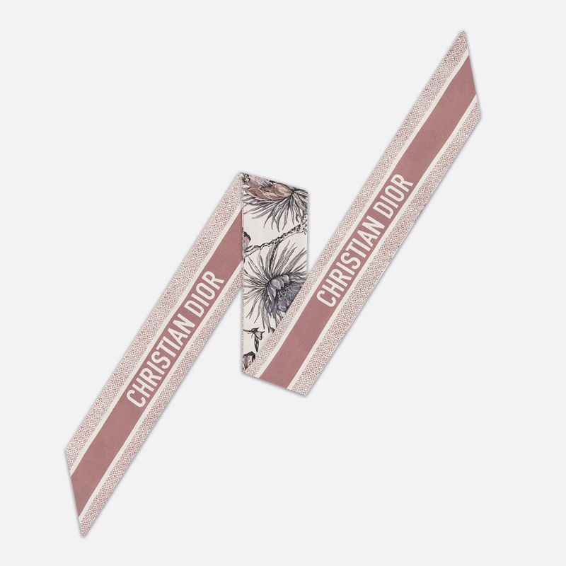 The Dior Mitzah Twill showcases a jacquard band adorned with the iconic CHRISTIAN DIOR signature on the back, underscoring the brand’s commitment to quality and heritage. With its pointed ends, this twill is versatile enough to be styled in numerous ways—whether draped gracefully around your neck or as a chic hair accessory.