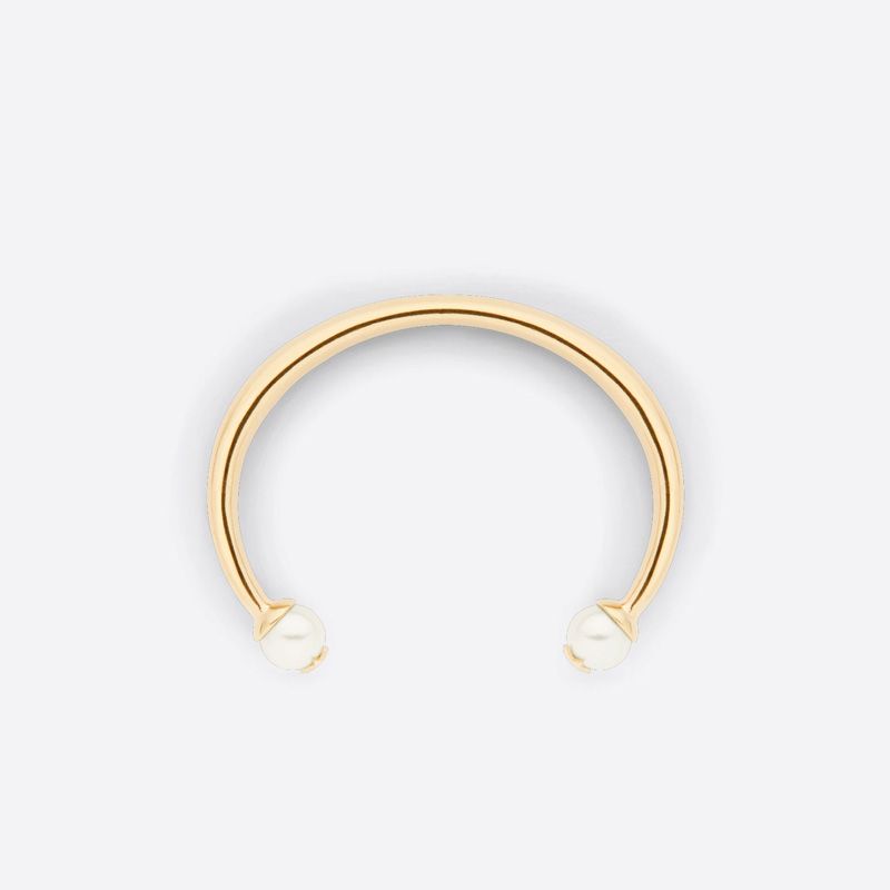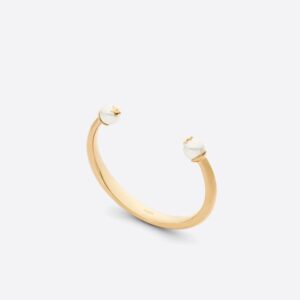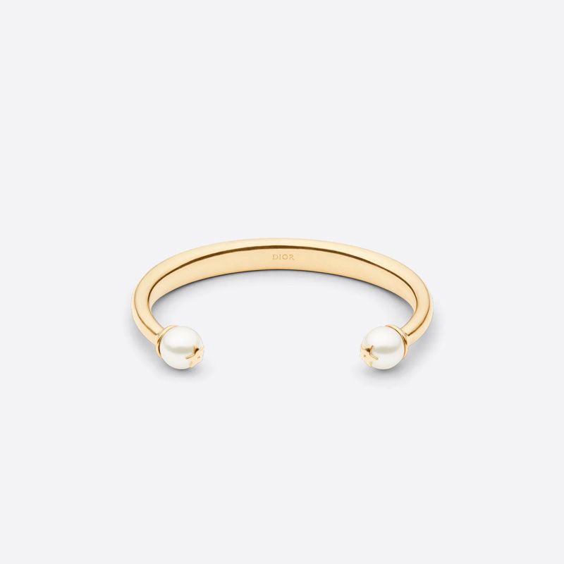 Introducing the Dior Tribales Bangle, a stunning piece of jewelry that effortlessly combines elegance with contemporary design. Crafted with a luxurious gold finish, this bangle features an open design that not only enhances its allure but also allows for a comfortable fit. The striking white resin pearls adorned with intricate star detailing add a unique touch, making this piece a true statement accessory.
