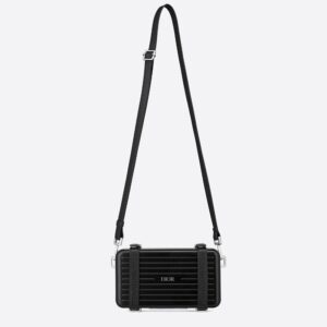 Crafted from high-quality aluminum and soft calfskin, this clutch combines durability with elegance. The iconic Dior signature on the front and the distinctive Rimowa logo on the back serve as hallmarks of its premium design. An adjustable and removable strap in black grained calfskin offers versatility, allowing you to transition effortlessly from a clutch to a chic crossbody.
