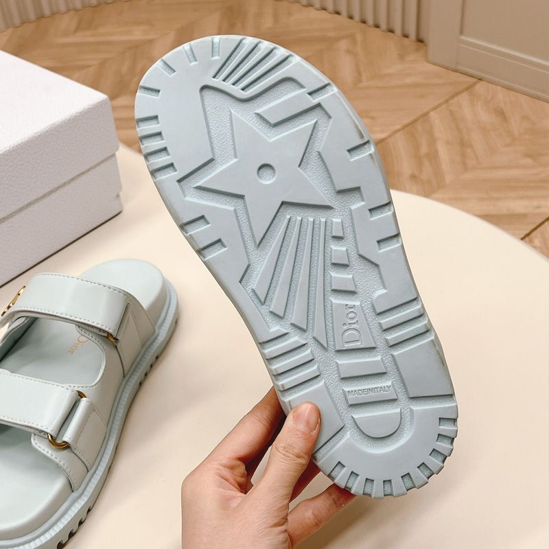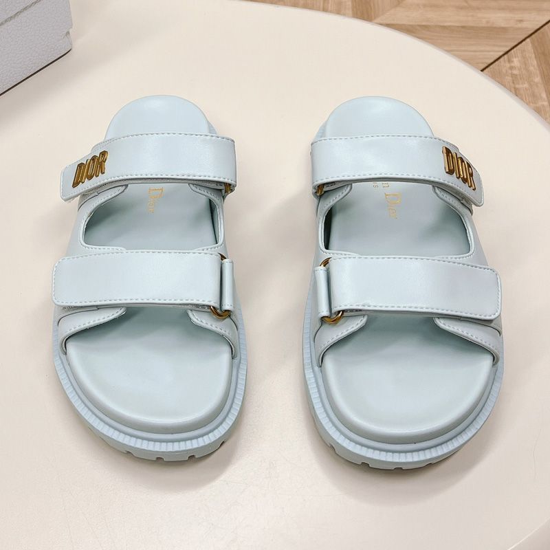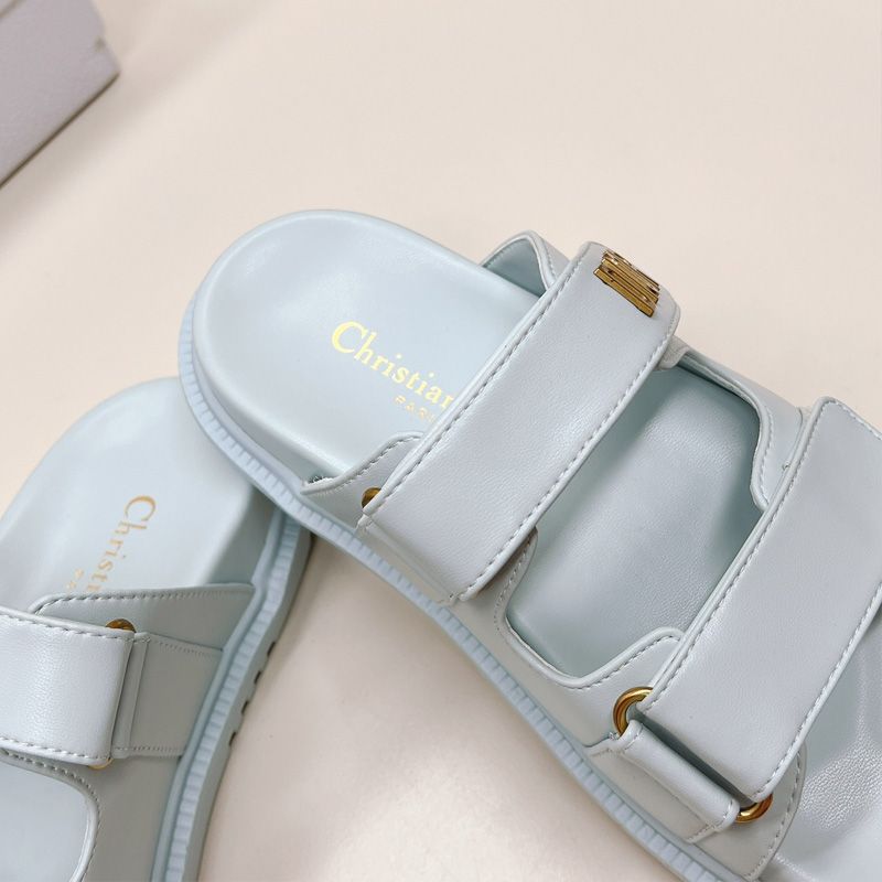 Step into elegance with the DiorAct Slides in a captivating light blue hue. These exquisite slides, crafted from premium calfskin, are not just footwear but a statement of refined style. Adorned with a gold-finish metal DIOR signature, they bring a touch of luxury to any ensemble.
