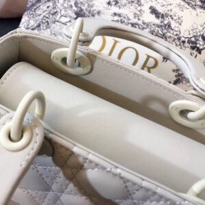 The striking white color of the Lady Dior My ABCDior Bag enhances its sophisticated allure. Crafted from ultramatte calfskin, it features the iconic Cannage stitching, a signature element that adds depth and texture to the design. Adorned with elegant metal D.I.O.R. charms, this bag is a true statement of style.