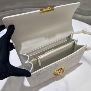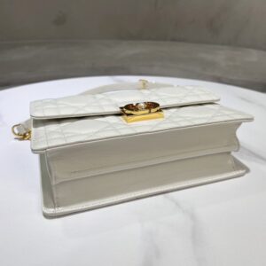 The bag showcases a striking metal top handle, elegantly engraved with “Christian Dior Paris,” symbolizing timeless luxury. Additionally, it comes with an adjustable CD link chain, finished in antique gold, adorned with resin pearls and a leather insert for a touch of glamour. Whether you’re at a formal event or a casual outing, this versatile bag ensures you stand out.