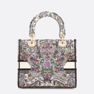 Introducing a remarkable blend of artistry and functionality—the Medium Lady D-lite Bag in the captivating Flowers Around the World motif. This exquisite bag showcases a stunning white canvas adorned with vibrant floral patterns, making it a piece that stands out in any collection.