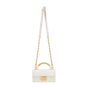 Featuring a beautifully engraved metal top handle that proudly displays “Christian Dior Paris,” this bag is as much a statement of style as it is a functional accessory. The adjustable CD link chain—finished in antique gold—boasts charming resin pearls and a leather insert, allowing for versatility in styling. Whether carried by hand or worn crossbody, the Mini Dior Ange Bag seamlessly elevates any outfit.