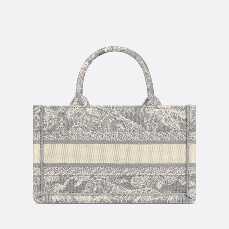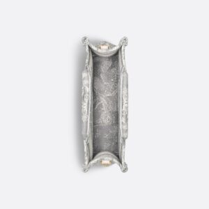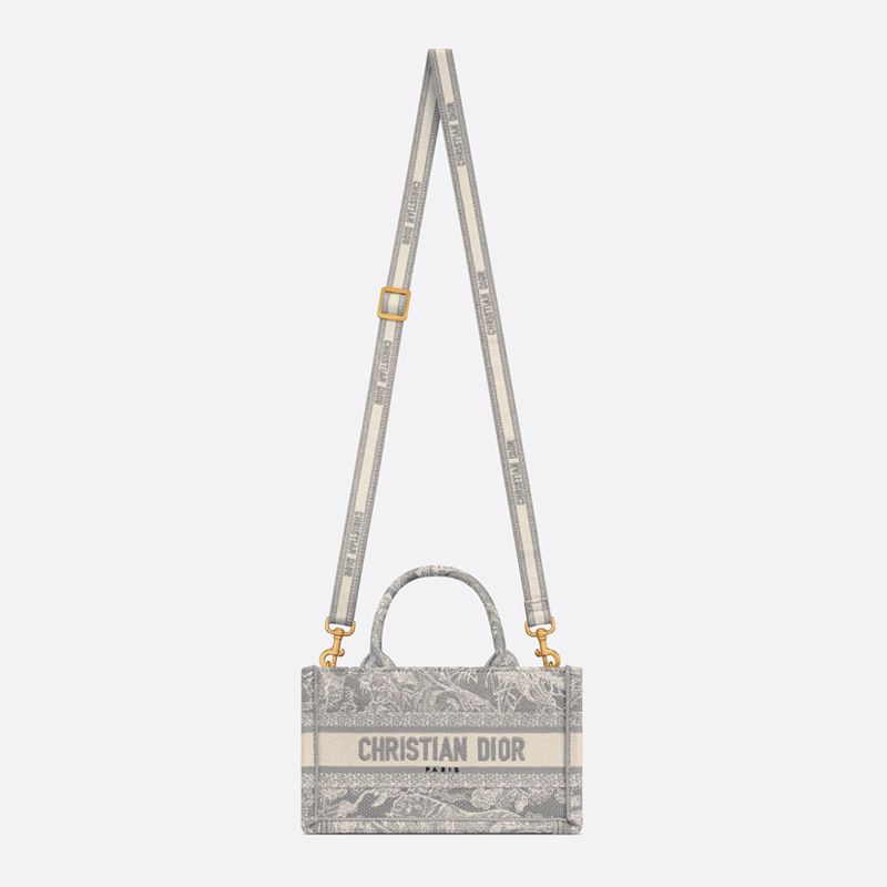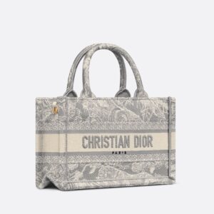 Embrace your individuality with the exquisite Mini Dior Book Tote in a stunning Toile De Jouy motif. This elegant tote, crafted from premium grey canvas, showcases the iconic Dior craftsmanship. Adorned with the Christian Dior Paris signature on the front, it serves as a statement piece for any fashionable ensemble.