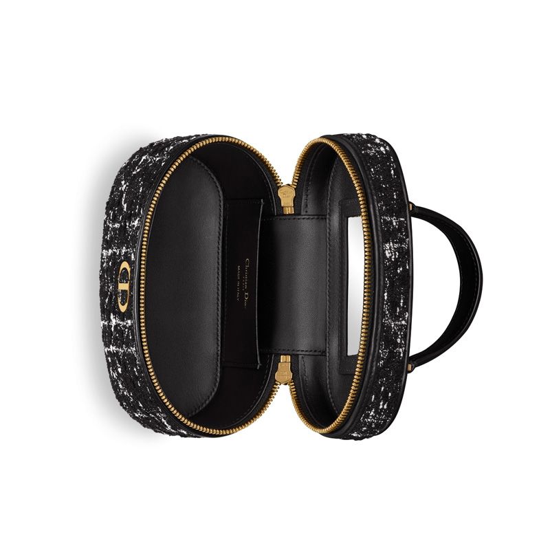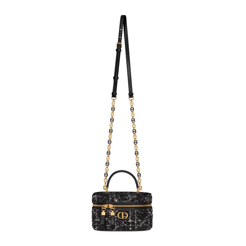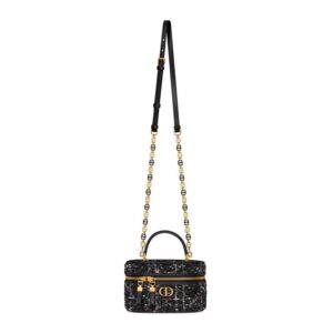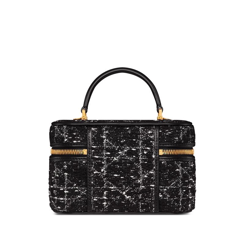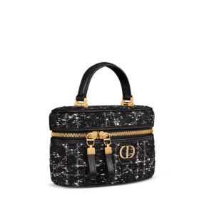 Step into a world of elegance with the Mini Dior Caro Vanity Case in Cannage Motif Tweed Black, a true passport to style. This exquisite vanity case is not merely an accessory; it is a statement of sophistication, designed for the modern individual who appreciates the finer things in life. Inspired by the iconic Dior aesthetic, this piece showcases a stunning tweed fabric adorned with the classic Cannage motif, creating a timeless appeal.