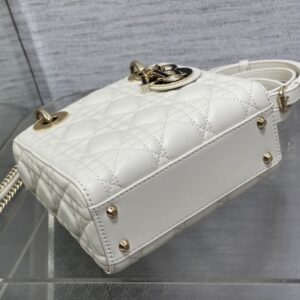 Celebrate your style with the Mini Lady Dior Bag in Enamel Cannage Lambskin, designed in a stunning White and Black palette. This exquisite handbag showcases the elegance of lambskin, adorned with iconic Cannage stitching that enhances its chic silhouette.