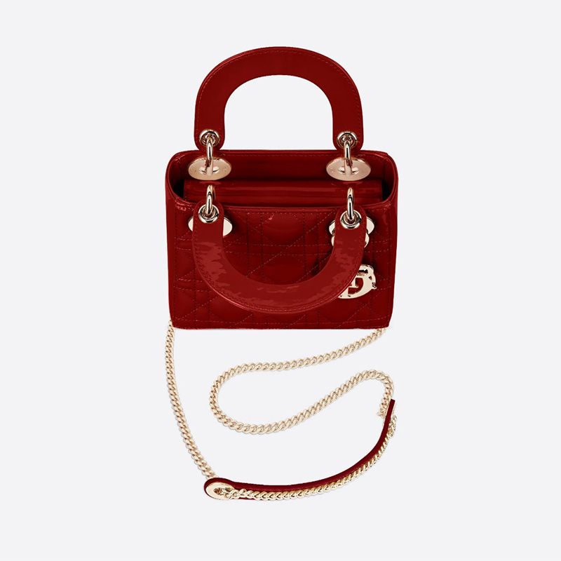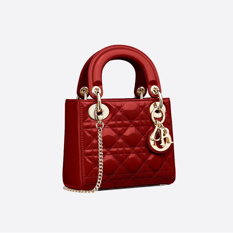 Introducing the exquisite Mini Lady Dior Bag, a stunning accessory that embodies elegance and sophistication in its vibrant red hue. Crafted from luxurious patent calfskin, this bag features the iconic Cannage stitching, a hallmark of timeless artistry. The addition of gleaming metal D.I.O.R. charms elevates its allure, making it an essential piece for any fashion-forward individual.