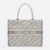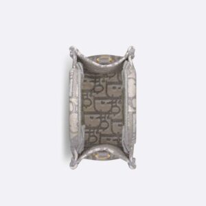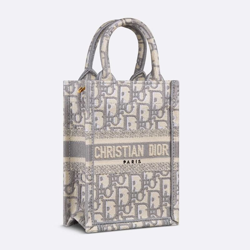 For an even more refined appearance, consider pairing the Mini Vertical Dior Book Tote with a stylish silk scarf that matches its grey tones. This combination will enhance your outfit and showcase your keen fashion sense.