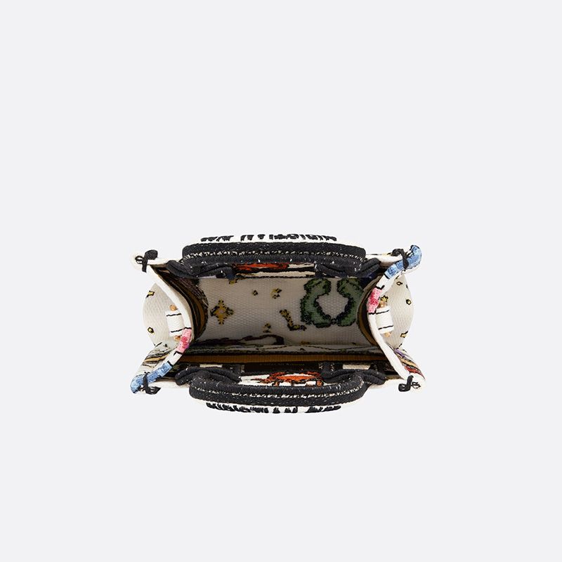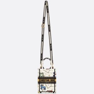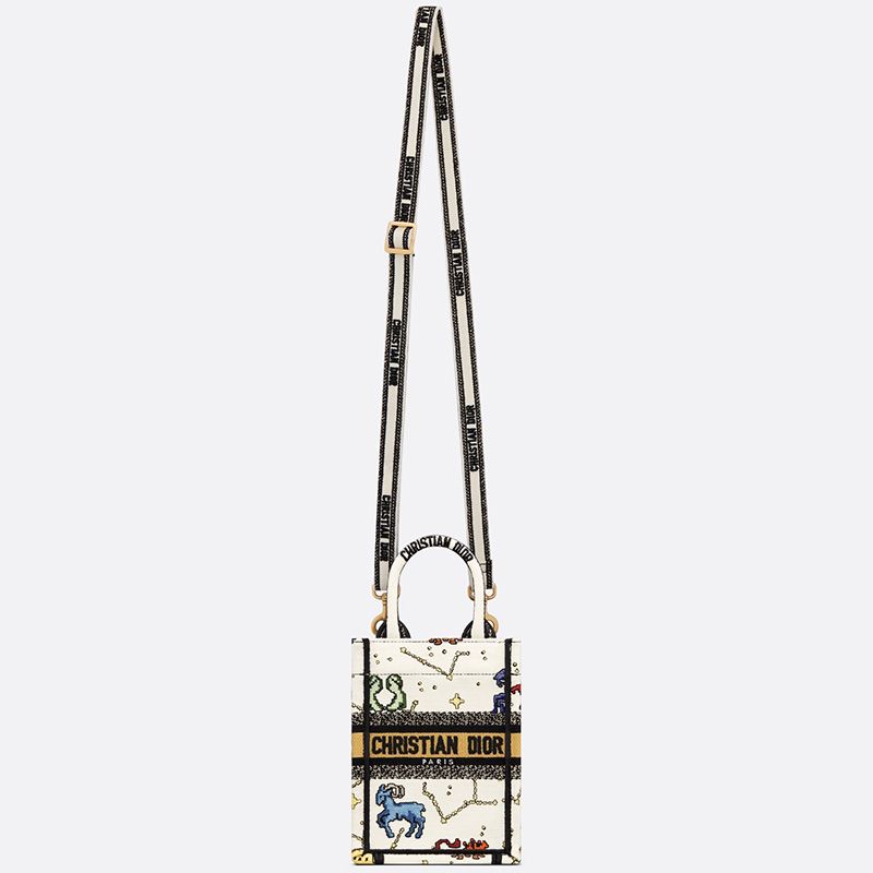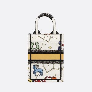 Mini Vertical Dior Book Tote with Strap In Pixel Zodiac Motif Canvas White