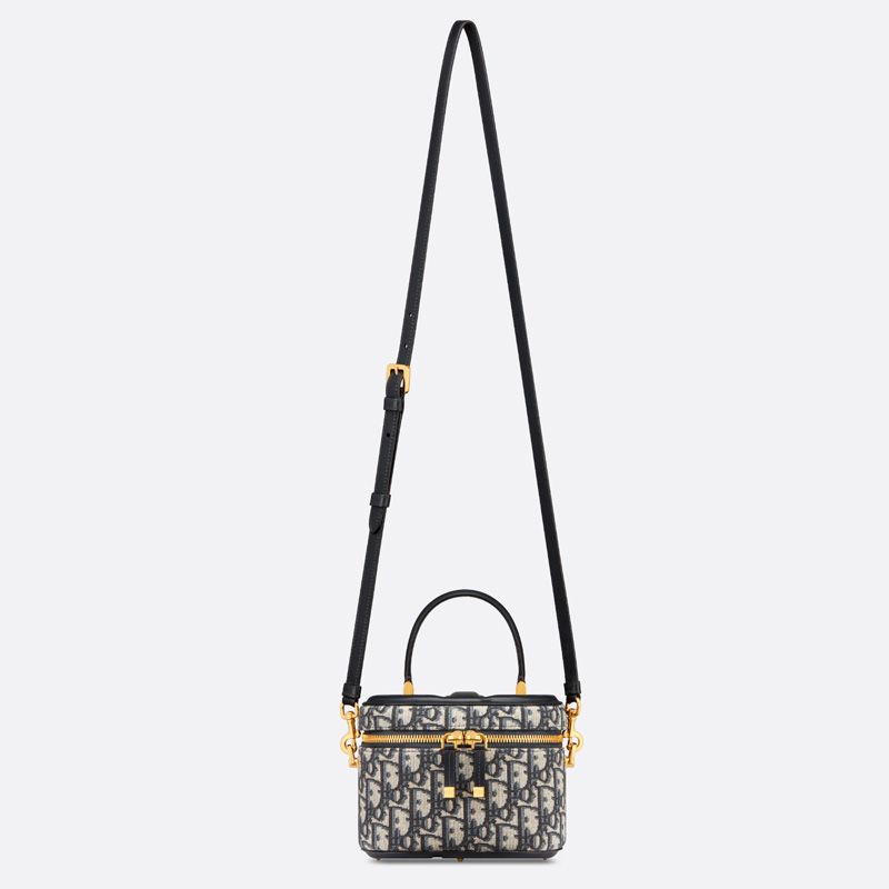The top of the case showcases the embossed CD signatures, a hallmark of Dior’s exquisite craftsmanship. Designed with functionality in mind, this vanity case includes a comfortable top handle and a removable, adjustable shoulder strap, allowing for versatile carrying options to suit any occasion.